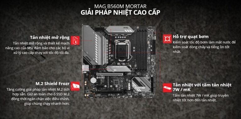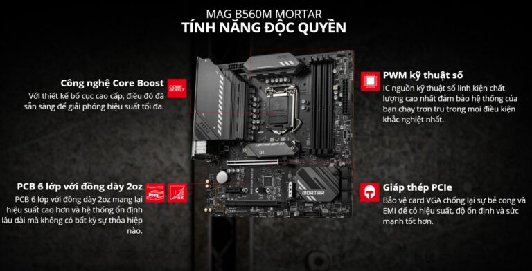 Bo mạch chủ MSI MAG B560M MORTAR có thiết kế PCB cải tiến với đồng dày 2oz làm tăng độ dẫn điện, cải thiện khả năng tản nhiệt, độ tin cậy và hiệu suất, đặc biệt là trong quá trình ép xung.