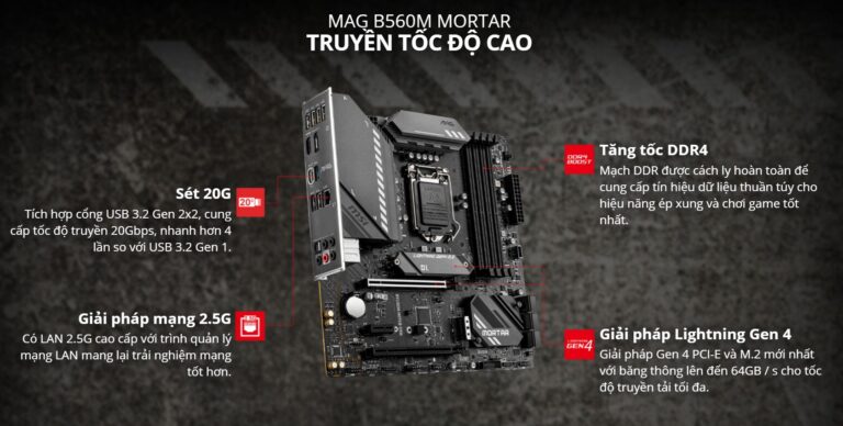 Mainboard MSI MAG B560M MORTAR được trang bị 6 lớp PCB cho phép băng thông cao hơn và tốc độ truyền nhanh hơn. Điều này cũng có lợi cho việc truyền mạch đáng tin cậy.
