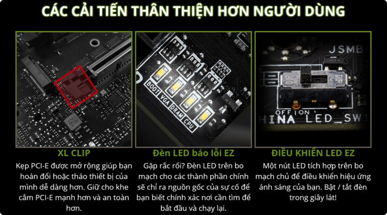 XL CLIP: Kẹp PCI-E được mở rộng giúp bạn hoán đổi hoặc tháo thiết bị của mình dễ dàng hơn. Giữ cho khe cắm PCI-E mạnh hơn và an toàn hơn.